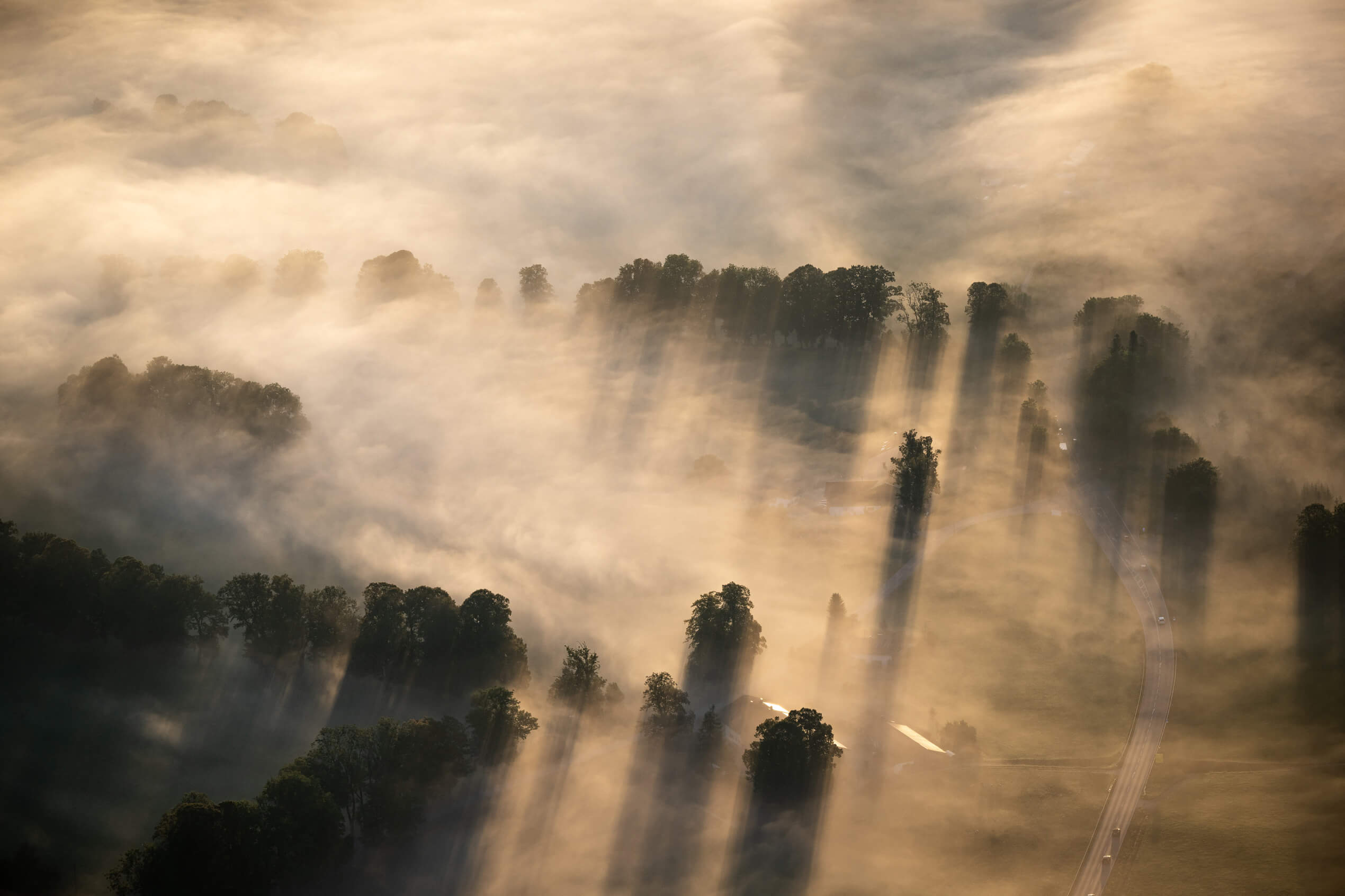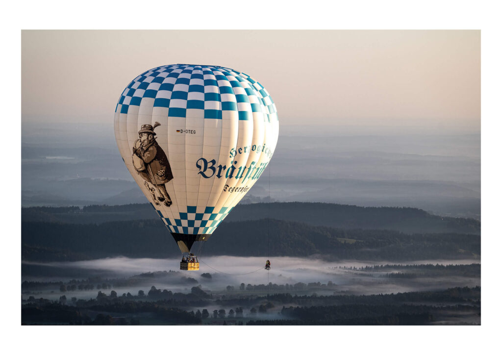 Ein außergewöhnliches, irritierendes Bild: ein Heißluftballon, an dem jemand befestigt ist – vielleicht noch der ruhige Nebel im Hintergrund. Doch was genau passiert?